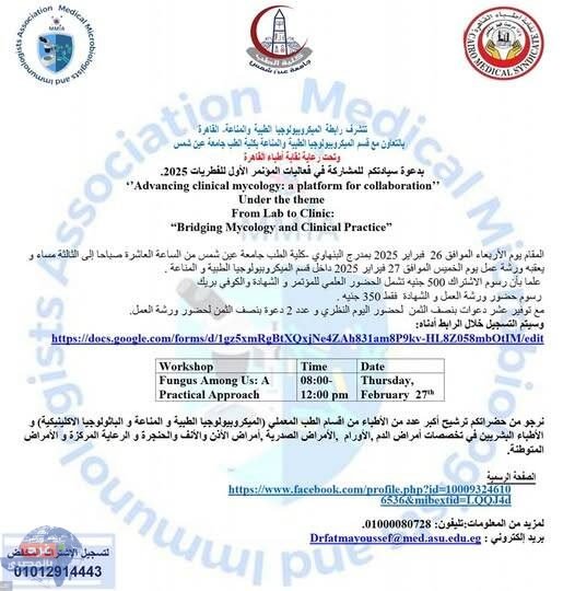 سيعقب المؤتمر ورشة عمل يوم الخميس 27 فبراير 2025 داخل قسم الميكروبيولوجيا الطبية والمناعة.